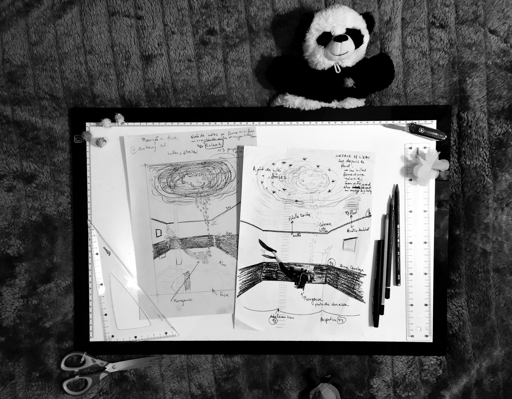 Création au quotidien pendant les 55 jours du confinement au printemps : à partir du 17 mars 2020 j’ai publié chaque jour une image réalisée avec les moyens du bords, peinture, photo, dessin. Des petites mises en scène avec les babioles, des esquisses, parfois des légendes documentées … Mon Confinorama comporte une seule proposition formelle, du noir et blanc.